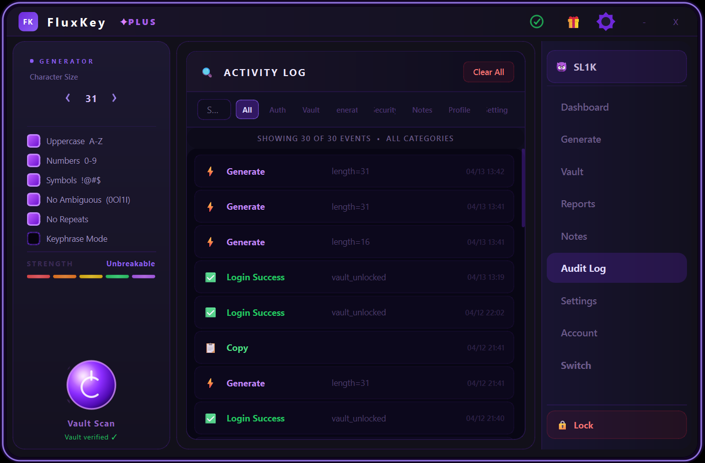 🔒 Auto-lock, clipboard auto-clear & full audit log