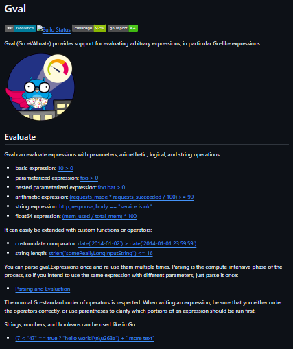 gval is a versatile expression evaluation library for Go, enabling developers to parse and evaluate expressions dynamically. It supports a variety of expression types, including arithmetic, logical, and text-based, and allows for the composition of custom languages by replacing functions and operators.