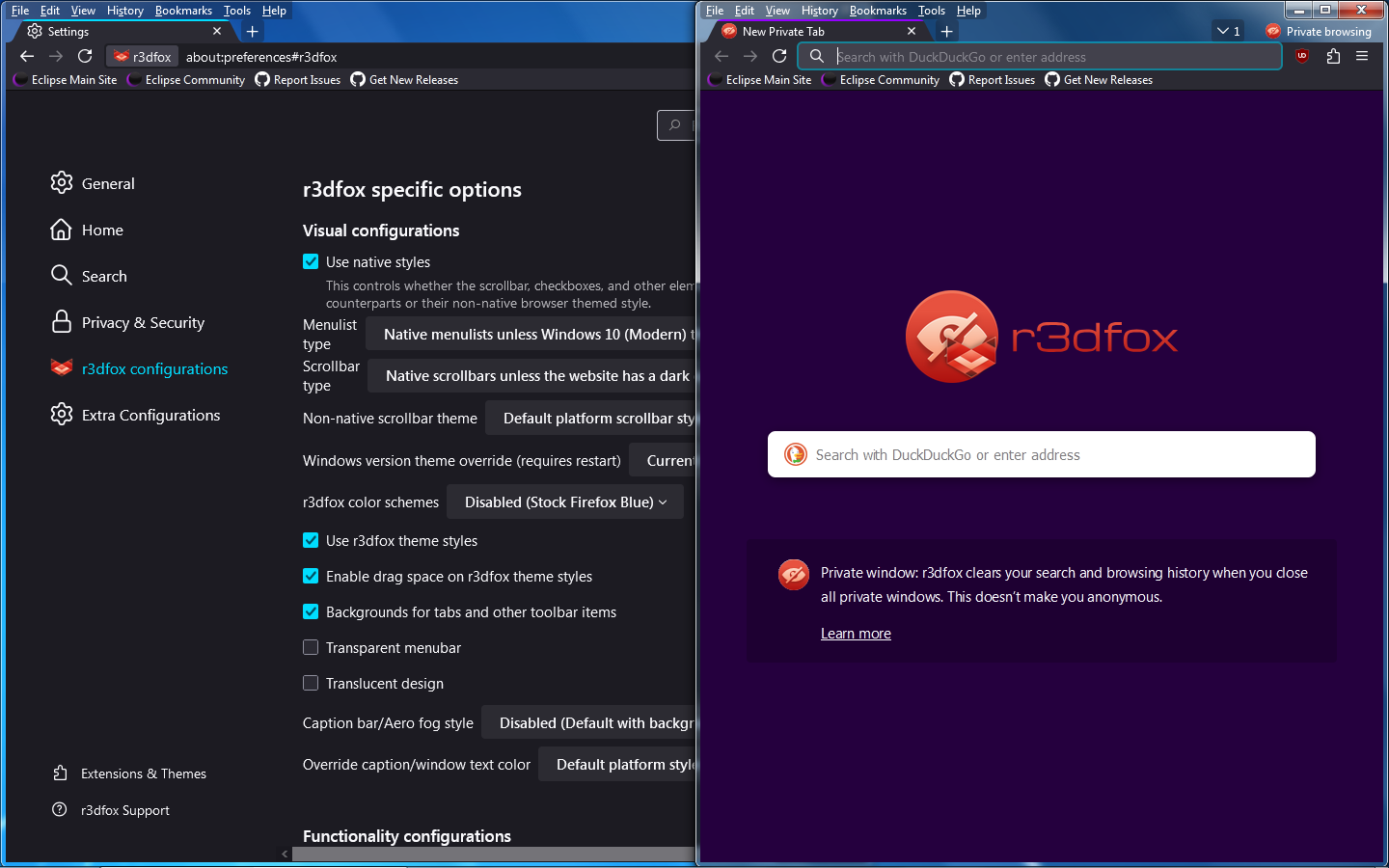 r3dfox or r3dactedfox is a fork of release branch Mozilla Firefox made for Windows Vista, 7, and 8. r3dfox also comes with limited compatibility for Windows XP using One Core API. Included are multiple tweaks from Librewolf, other browsers, and our own tweaks. Our browser even has a custom theme. You can disable any of this at will for a more stock experience if you want to.
